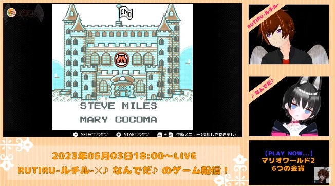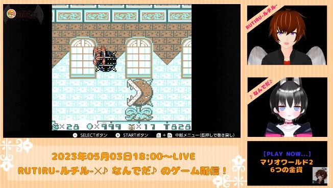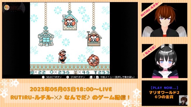 今回遊んだゲームはNintendoSwitchオンラインのゲームボーイにて配信中の「スーパーマリオランド 6つの金貨」にチャレンジしました。番組から数時間は順調にゲームを進めることができゲームクリアも簡単かと思われたが・・・ゲームオーバーになるとボスのコイン返却?絶望しつつもRUTIRU-ルチル-と♪なんでだ♪は力を合わせてクリアを目指していきます。