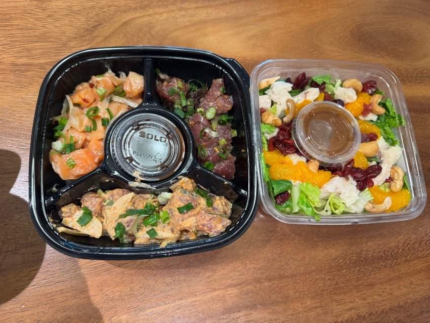 夜ご飯はポキ3種類(マグロのポキ、サーモンのポキ、サーモンの激辛ポキ)とサラダ