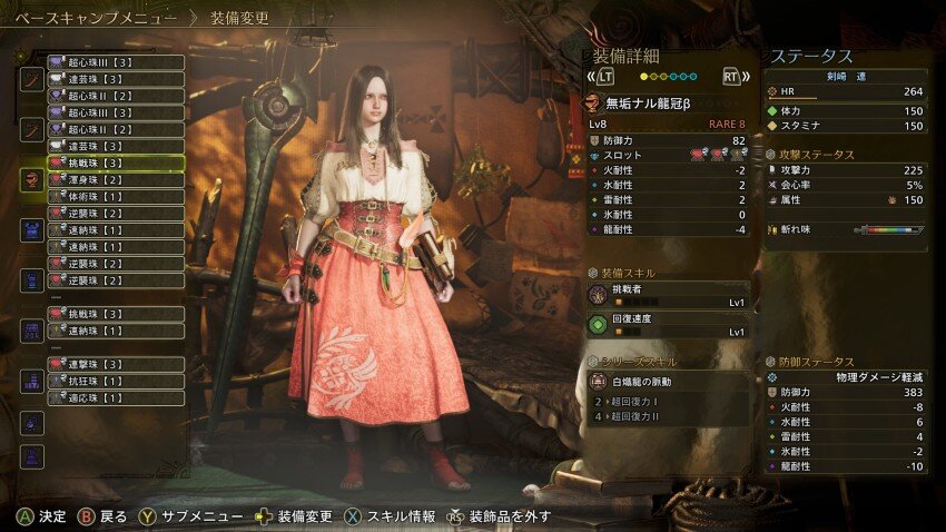 挑戦珠3スロを2つ、連撃珠3スロを1つ、逆襲珠2スロを3つ、渾身珠2スロを1つ、速納珠1スロを3つ、抗狂珠1スロを1つ、体術珠1スロを1つ、適応珠1スロを1つです。