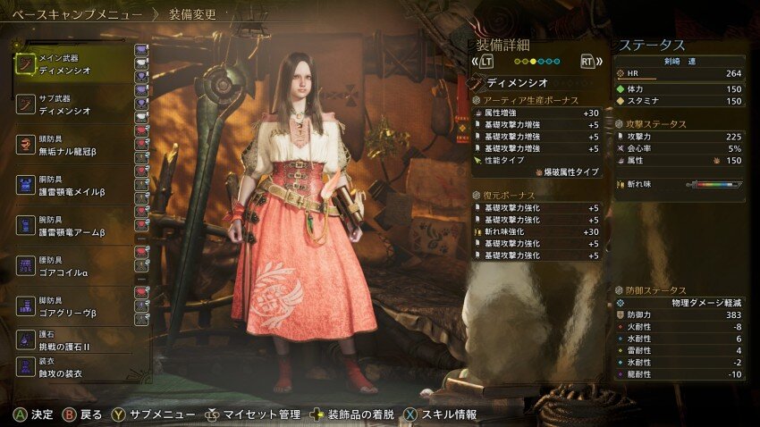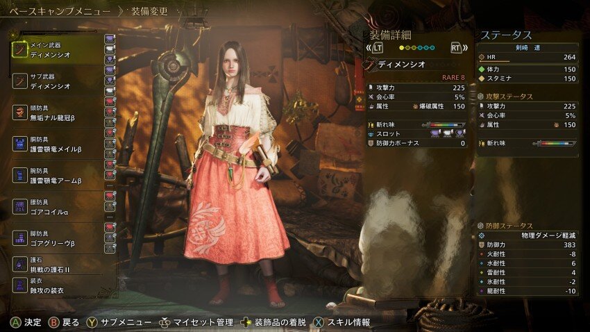 防具の詳細は、ゾシアの頭、アンジャナフ亜種の胴と腕、ゴアマガラの腰と足です。